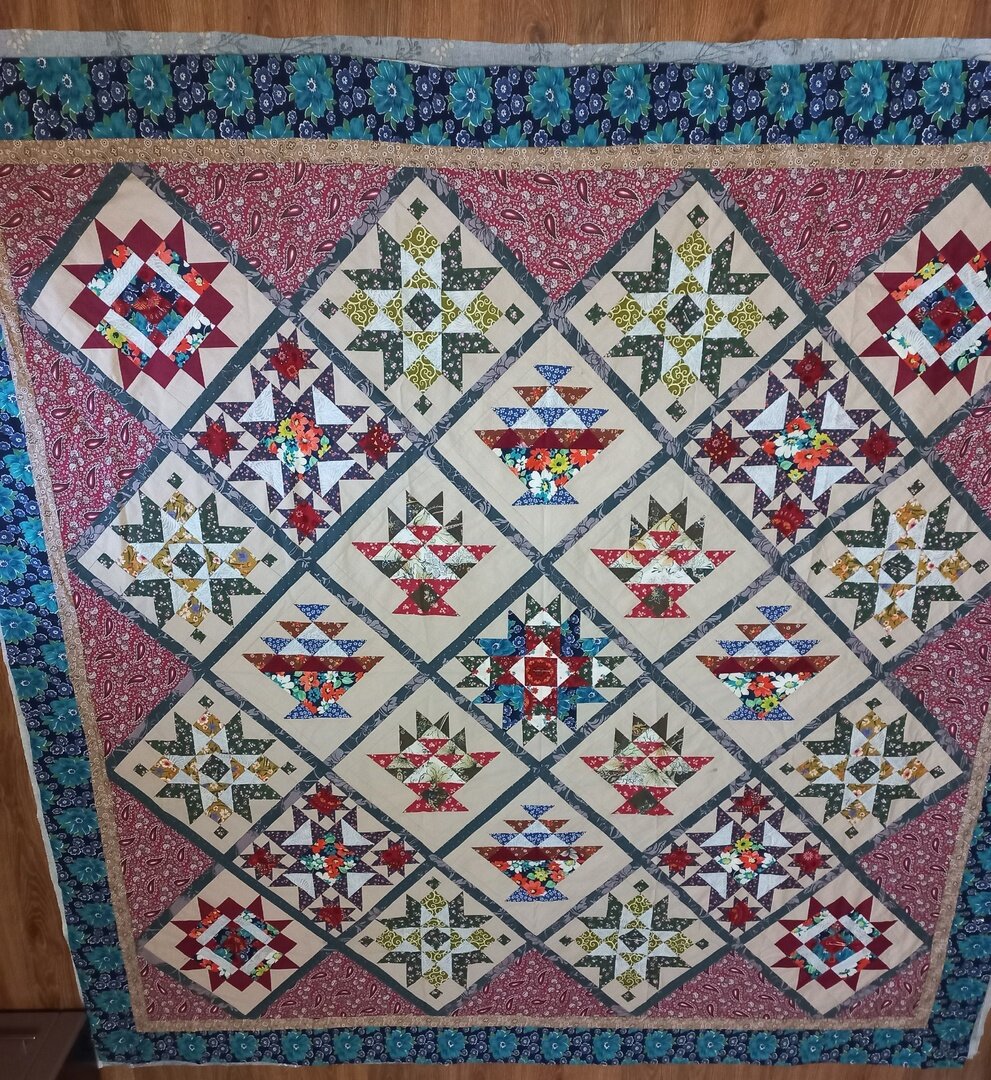 С чем у нас ассоциируется лоскутное шитьё? Конечно, с лоскутными одеялами. Сегодня в хит-параде лучших ваших работ недели - одеяла, одеяла и одеяла. Классические, красивые, родные. На любой вкус! Напомню, что по понедельникам в группе "Я люблю пэчворк" ВКонтакте вы делитесь фотографиями готовых квилтов или процессов, а я по вторникам в Дзене показываю фотографии пяти самых популярных работ, набравших наибольшее количество сердечек и комментариев. Есть такое выражение: "Смесь французского с нижегородским". Означает оно смешение несовместимого и пришло в наш язык из пьесы А.С. Грибоедова "Горе от ума". Раньше часто употреблялось в негативном смысле, хотя сегодня, в эпоху пост-пост-пост модернизма ничего плохого в неожиданных сочетаниях нет. Получается потрясающий результат! Галина Яговкина сшила из российских тканей одеяло по схеме Ким Дил. Ну разве не прелесть? Какие красивые блоки! Интересная раскладка, неожиданная заполняющая ткань с огурцами. И бордюр с синими цветами. В этом вих