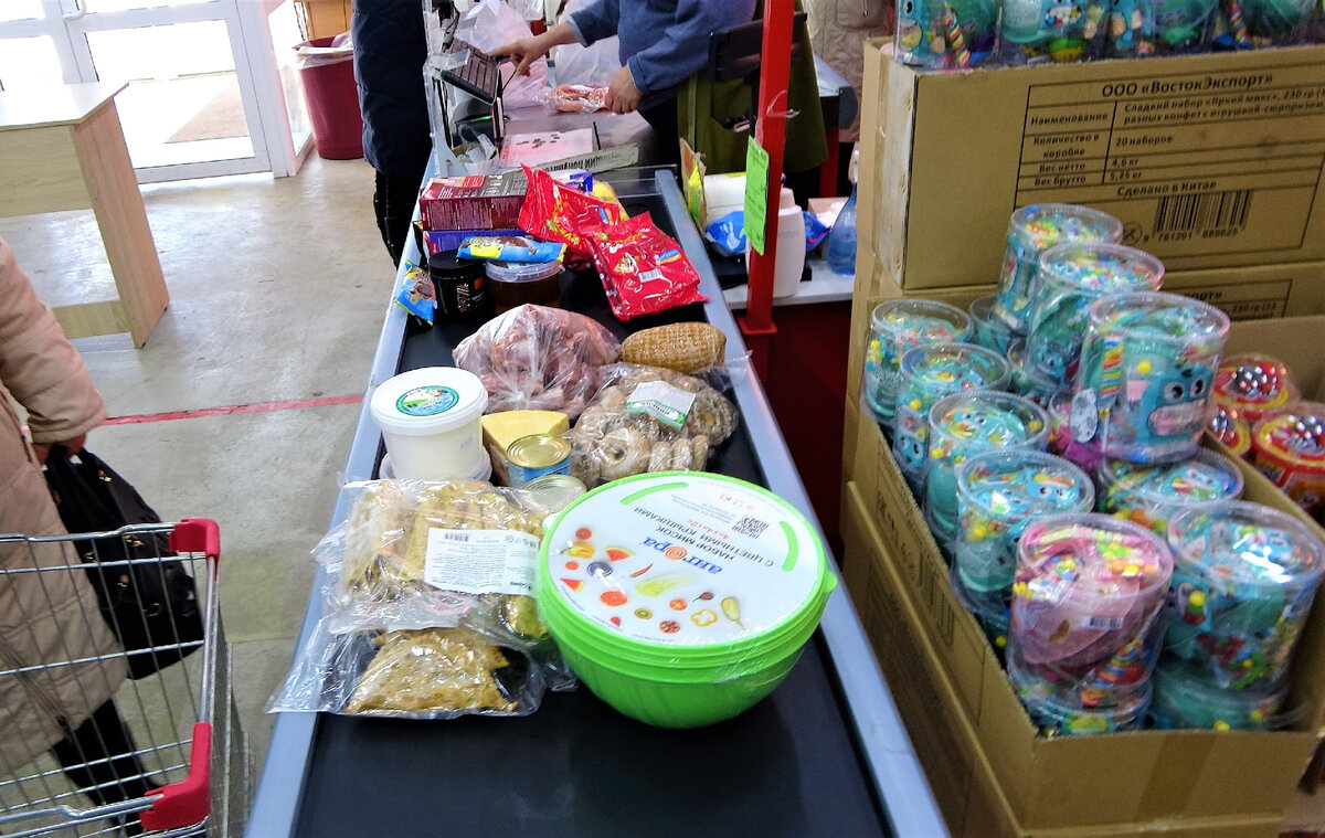 Снова мы в Светофоре, на кассе, как всегда очередь, берут много продуктов самых разных. Отличную рыбу раскупают в морозильном отделении из свежего привоза. Новый чай с мальвой привезли. Для хозяйства появились удобные стеллажи, ящики для хранения на колесиках, баки пищевые с крышкой. Корзинки по бюджетной цене, всего 221 руб.