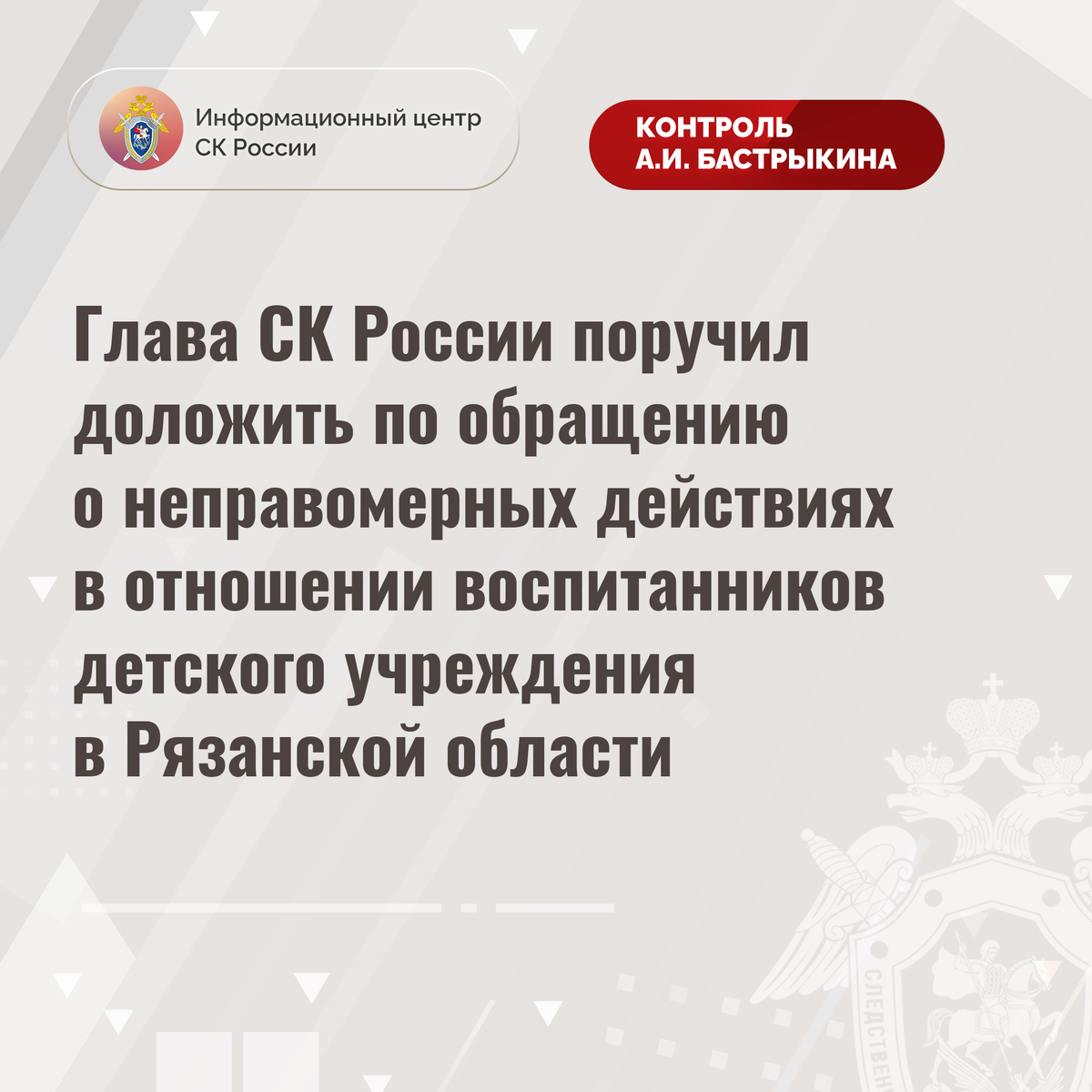 Глава СК России поручил доложить по обращению о неправомерных действиях в отношении воспитанников детского учреждения в Рязанской области