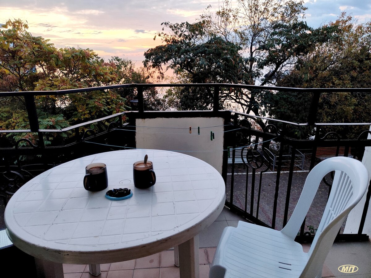 Вставать утром мы привыкли рано. И если, пока работали, по будильнику утром проснуться было сложно и неприятно, то теперь мы и без будильника просыпаемся примерно в 6.00 - 6.30. Завтрак в санатории поздно, с 9 утра. Поэтому мы делаем кофе и пьем его на балконе, любуясь рассветом над морем.