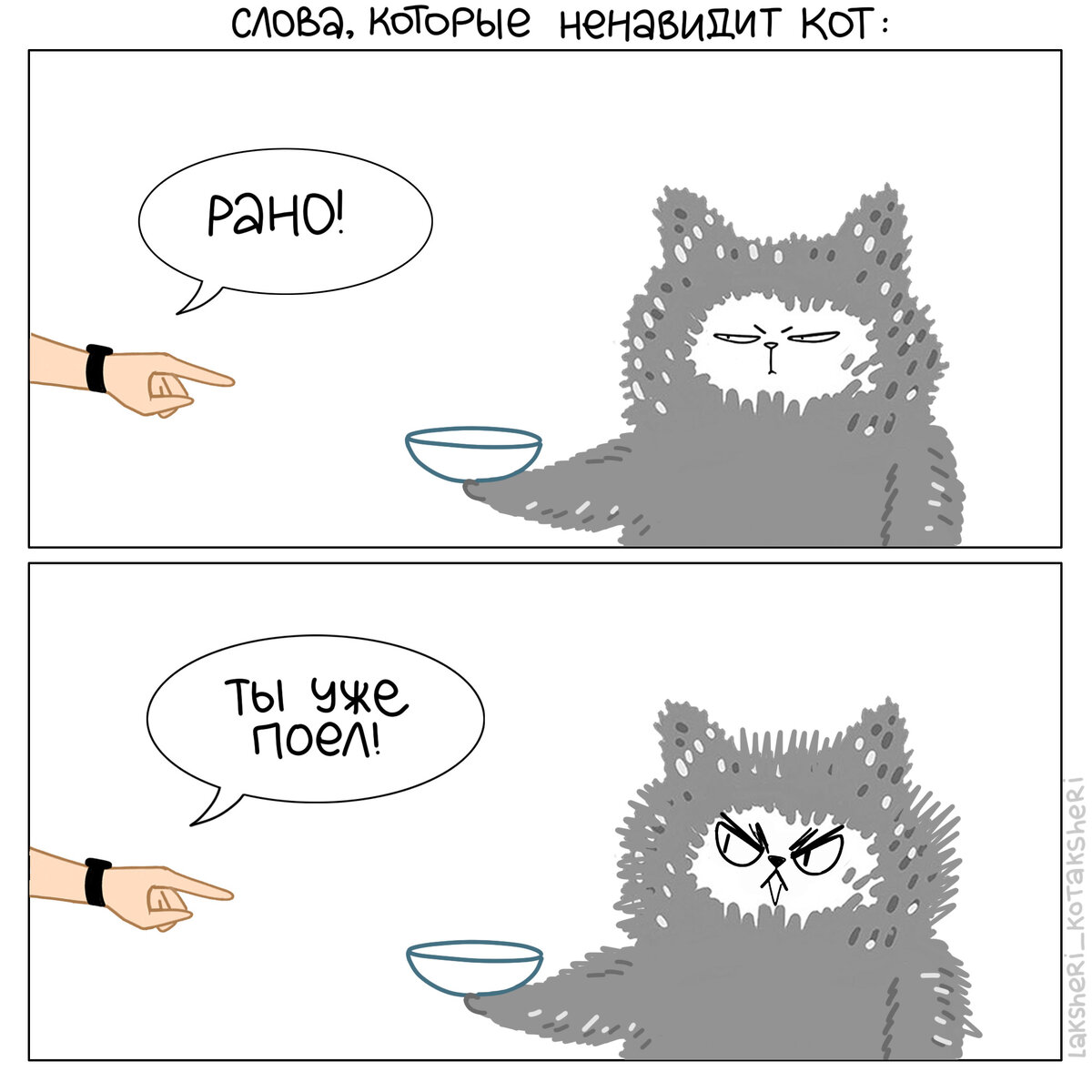 Если живёшь с котом, рано или поздно приходится выучить кошачий язык😺 Например, знать, какие слова бесят твоего кота: Но всегда есть заветное слово «шкаф»! Начинаешь понимать, за что тебе даются ночные страдания🤣 И прекрасно понимаешь даже мимику животного: Но у этого понимания кошачьего языка иногда возникают проблемы: Но не только мы учимся понимать котов, но и они нас: Хотя всё равно иногда возникают недопонимания: Но в конце концов мы приходим к взаимопониманию: А как у вас со взаимопониманием? Удаётся договориться с вашим котиком?)