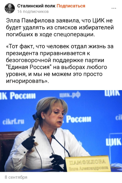 Фейк, родившийся из злой шутки. В Центризбиркоме России заявили, что не будут исключать из списков избирателей военных, не вернувшихся со спецоперации на Украине. «Тот факт, что человек отдал жизнь за президента, говорит о его безоговорочной поддержке… Мы не можем это просто игнорировать», — приводят слова главы ЦИК в соцсетях. Разбираем фейки. Ищем правду за вас. Подписывайтесь! Однако это 100% фейк. Председатель ЦИК ничего подобного не говорила. Впервые новость опубликовали в канале сатирических новостей еще в июле 2022 года. И периодически сообщение расходится по соцсетям. Те, кто репостил сообщение на полном серьезе, не потрудились прочесть описание канала, в котором говорится: «Весь текст — сатирический вымысел, все совпадения случайны». Вероятно, создатели фейка попросту вдохновлялись творчеством Гоголя.