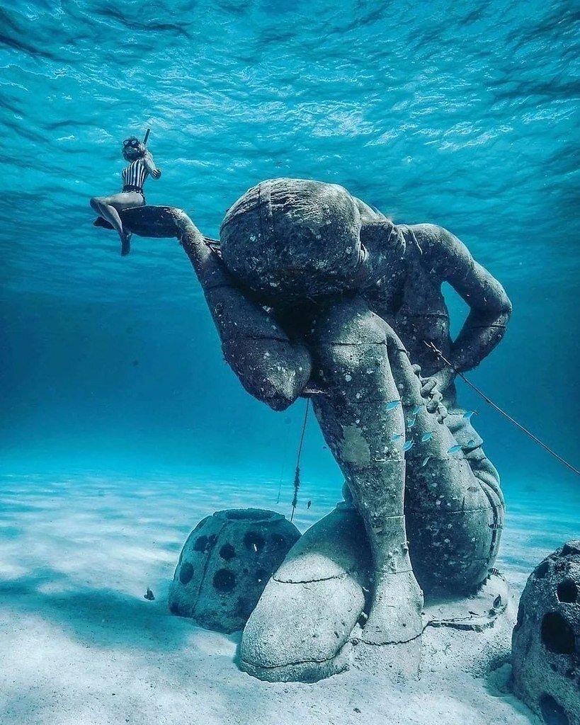 Самая большая подводная скульптура в мире «Океанский Атлант». Ее высота - 5,5 метров, находится на Багамах. Древние статуи часто оказываются под водой, ведь прибрежные районы, на которых они раньше стояли, затапливались. Но здесь статую так расположили нарочно. В отличие от древнегреческих статуй в Средиземном море, эта скульптура - новодел. Создал ее Тейлор. «Океанский Атлант» держит в ладони весь мировой океан. И символизирует необходимость, с которой человек должен заботиться об окружающей природе. Сейчас статуя обрастает морскими жителями и превращается в коралловый риф.