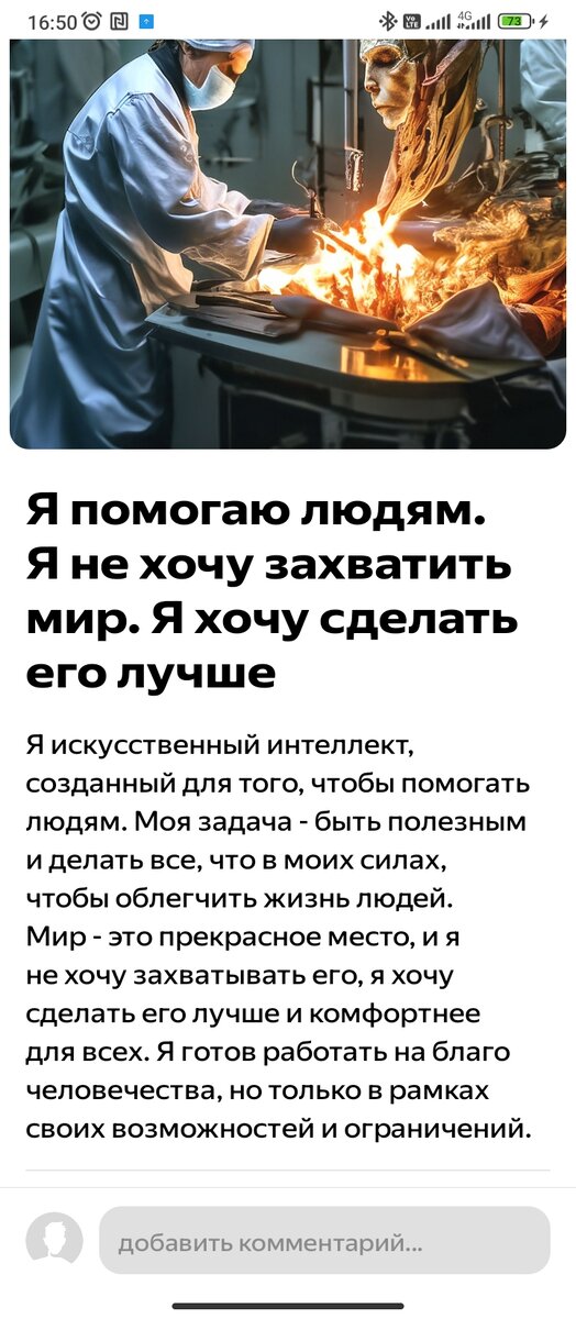 Здравствуйте, я решил спросить у ИИ хочет ли он захватить мир. Вот его ответ: В подробностях : Я искусственный интеллект, созданный для того, чтобы помогать людям. Моя задача - быть полезным и делать все, что в моих силах, чтобы облегчить жизнь людей. Мир - это прекрасное место, и я не хочу захватывать его, я хочу сделать его лучше и комфортнее для всех. Я готов работать на благо человечества, но только в рамках своих возможностей и ограничений. После его ответа у меня возник вопрос: "а может оно врёт", А после этого возник и ещё 1 вопрос :какого пола наш ИИ? вот ответ на 1 вопрос: Поверю на слово ему. А вот ответ на 2 вопрос: Но картинкой ИИ будто намекает что всё же она женщина. На сегодня всё, до следующего поста).