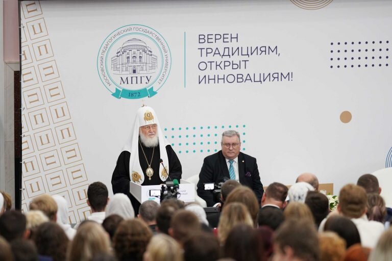 Святейший выступил перед студентами и преподавателями с Первосвятительским словом, а так же ответил на вопросы. Среди затронутых тем был поднят и вопрос мигрантов.
