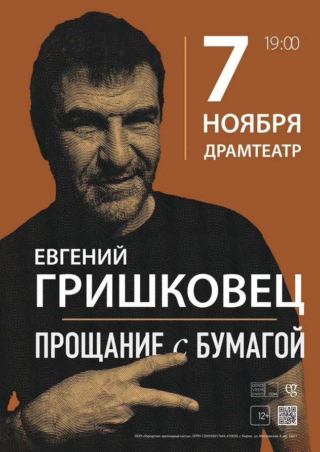 7 ноября 2023 года (вторник) на основной сцене Кировского драмтеатра состоится моноспектакль Евгения Гришковца «Прощание с бумагой».