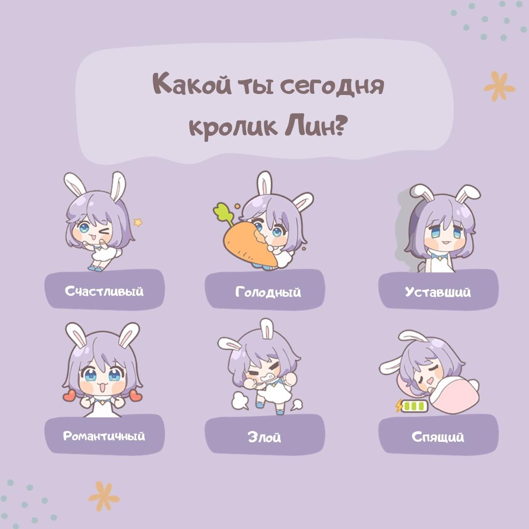 А какое у вас сегодня настроение по шкале кролика Лин?^^ Всем голодным, уставшим и спящим мы желаем хорошенько отдохнуть и расслабиться вместе с Лин в игре Idle Moon Rabbit🐰💤