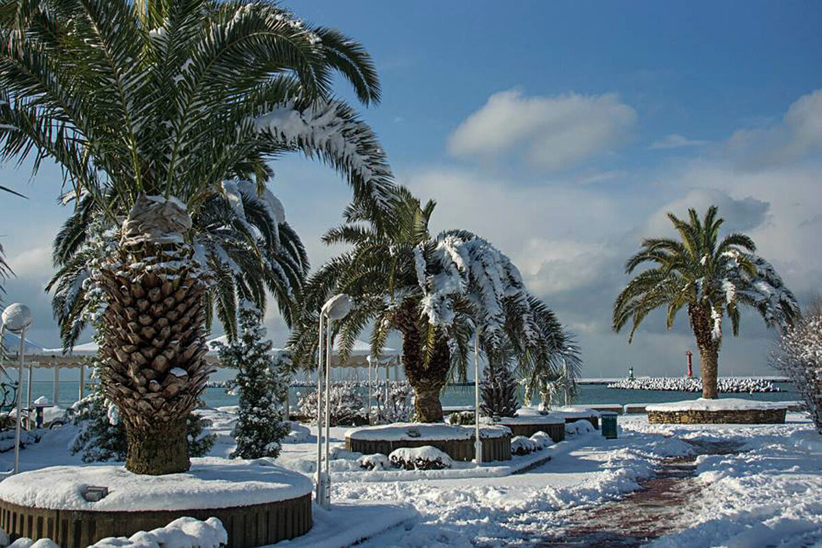Ну а если повезет, то в Сочи можно увидеть уникальное явление – пальмы в снегу (и водить хороводы вокруг них вместо ёлочек)! Ну а если не повезет, то всегда можно съездить за снегом на Красную Поляну.