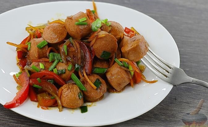 О! Сосисочки! Ингредиенты : Сосиски — 190 г (3 шт.) Перец болгарский красный — 90 г (1 некрупный) Лук репчатый — 80 г (1 шт.) Морковь — 90 г (1 шт.) Соевый соус — 50 мл Паприка молотая — 0,5 ч. ложки Соль — по вкусу Перец чёрный молотый — на кончике ножа Масло растительное — 30 мл (2 ст. ложки) Лук зелёный — 20 г (2-3 шт.) Приготовление : Выбирайте сосиски хорошего качества, от этого зависит вкус готового блюда. Сосиски очистите от оболочки и нарежьте порционными кусочками (размером 1-1,5 см).