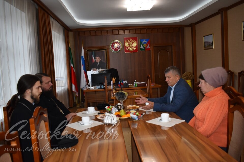 В совете района состоялась встреча главы района с представителями православного духовенства. Сегодня представители Аксубаевского благочиния под руководством благочинного и настоятеля храма Феодосия Тотемского протоиерея Александра Качаева были приглашены на встречу в совет района. В беседе с главой района Камилем Гилмановым обсудили важнейшие вопросы приходской жизни, развития духовной жизни в районе, затронули актуальные вопросы сегодняшнего дня. В настоящее время на территории района действуют десять приходов, один храм строится в деревне Черемушка, Дмитриевская церковь Казанской Божьей Матери – является духовным наследием нашего района, считается памятником регионального значения. В следующем году храму Феодосия Тотемского исполнится 30 лет. Сегодня проводятся работы по благоустройству территории, идет прокладка брусчатки. На встрече отметили позитивную тенденцию на развитие религиозной жизни в районе. Александр Качаев от лица всех приходов поблагодарил руководителей района, органи