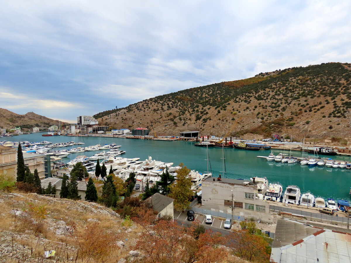 Вот я и опять в Севастополе. Много куда планировала сходить, но как-то обстановка этому не совсем благоприятствует. Решила прогуляться на гору Кефало-Вриси, которая возвышается над Балаклавской бухтой. Оттуда и вид красивый и кое-что надо проверить. Вышла с маршрутки за остановку до набережной и пошла вверх по уже полюбившемуся мне серпантину. Нравится мне здесь то, что уже немного приподнявшись можно весь следующий путь любоваться мягкими изгибами бухты и гор. Прогулка была 24 октября. У многих уже и золотая осень прошла и первый, а то второй снег выпал. Пусть Вас не смущают тучи! Погода далеко не осенняя! Эти дни у нас аномальная жара для этого времени. И в момент прогулки было +23 градуса и на мне была только одна рубашка. Хотя в рюкзаке была и курточка, и жилеточка. Кто его знает какой ветер задует! Пока рассказывала про погоду, тихонько шла вверх, останавливаясь и оглядываюсь вокруг. А вокруг летают птички стайками. щебет стоит, как весной. Фотографировала каждый желтый листи