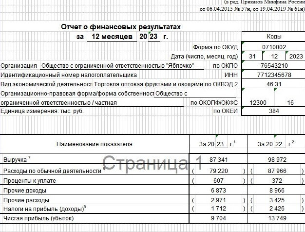 В отчет о финрезультатах за 2023 год были занесены следующие сведения: