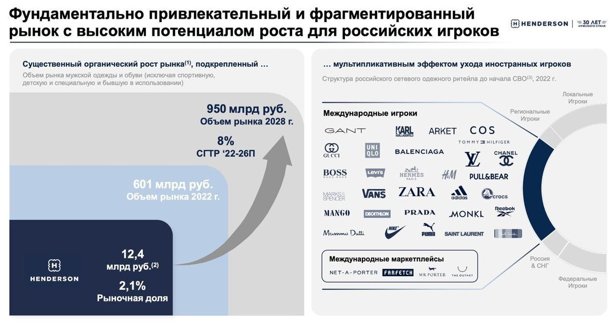 Ранее ходили слухи о возможном выходе Henderson на IPO, а после яркого размещения ASTR, они только усилились. На прошлой неделе Henderson пролил свет на свои планы провести листинг на Мосбирже, а сегодня стали известны подробности размещения, которые мы и разберем. Давайте изучим динамику финансовых показателей самой компании и посмотрим на оценку. Henderson уже 30 лет специализируется на продаже мужской одежды, обуви и аксессуаров. Имеет 159 салонов в 64 городах России и 2 салона в Армении. Каждый год магазины и сайт компании посещает более 18 млн человек, из них более 10,5 млн посетителей салонов и более 7,5 млн посетителей сайта. В 2022-2023 гг. компания показала высокие результаты за счет ухода ряда иностранных брендов и повышенной инфляции. Амбициозная стратегия развития позволяет и дальше наращивать продажи. Выручка за первое полугодие 2023 года выросла на 32% до 7 млрд рублей. Показатель EBITDA по МСФО 16 увеличился на 38% г/г и достиг 2,7 млрд рублей. Если посчитать форвардный