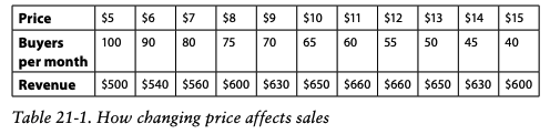 В отличие от Marshall, в вашем распоряжении крупнейшая в мире лаборатория ценообразования - Интернет. Вы можете протестировать коды скидок, рекламные акции и даже различные цены на своих клиентах и посмотреть, что произойдет. Допустим, вы провели серию тестов на цену вашего продукта. Вы знаете, что при изменении цены вы продаете определенное количество товаров (см. таблицу 21-1).
