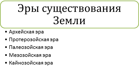 Разделение на эры и периоды условно. Каждую эру связывают с каким-то эволюционным этапом. Принято выделять пять эр: архейскую, протерозойскую, палеозойскую, мезозойскую и кайнозойскую (рис. 1).