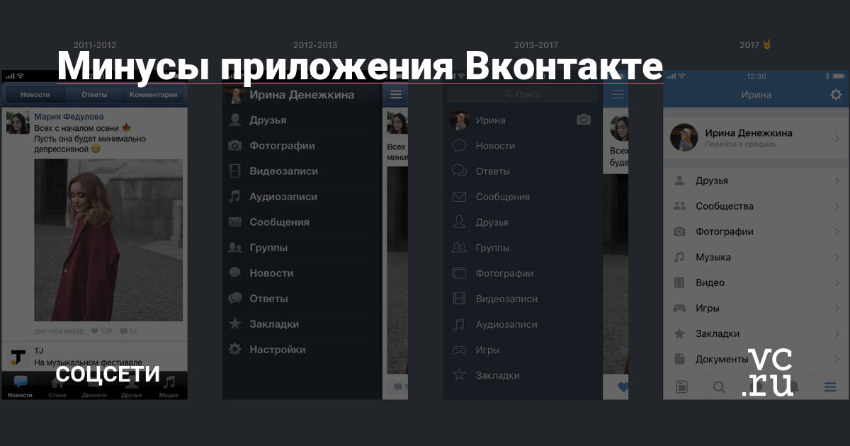 До сих многие из нас им пользуются. Зачем? Думаю чисто из ностальгии. Хочу собрать здесь минусы ВКонтакте. Прежде всего скажу, что ВКонтакте стал очень тяжелым (и не в плане веса приложения). Тут тебе и мессенджер, и социальная сеть, и клипы (привет Tik-tok), такси, доставка еды и прочее. Разработчики видимо хотели дать людям все, чтобы лишь удержать, но вызвали только отвращение. Распыление на разные тематики вышло боком. Дизайн. Уверен многие задаются этим вопросом, ну почему разрабы и дизайнеры НЕ слышат нас, постоянных пользователей приложения, и не идут нам на встречу? Слишком уверены, что от ВКонтакте не отказаться? Все мы помним первый редизайн приложения со шторкой сбоку, далее его переделали и вынесли основные (главные) блоки вниз, что не сильно помешало. Было непривычно первое время, но нельзя не отметить уменьшившееся кол-во кликов, чтобы открыть сообщения. Не нужно было свайпать вбок, чтоб открыть шторку, теперь при заходе в сообщения палец сразу нажимал в центр с