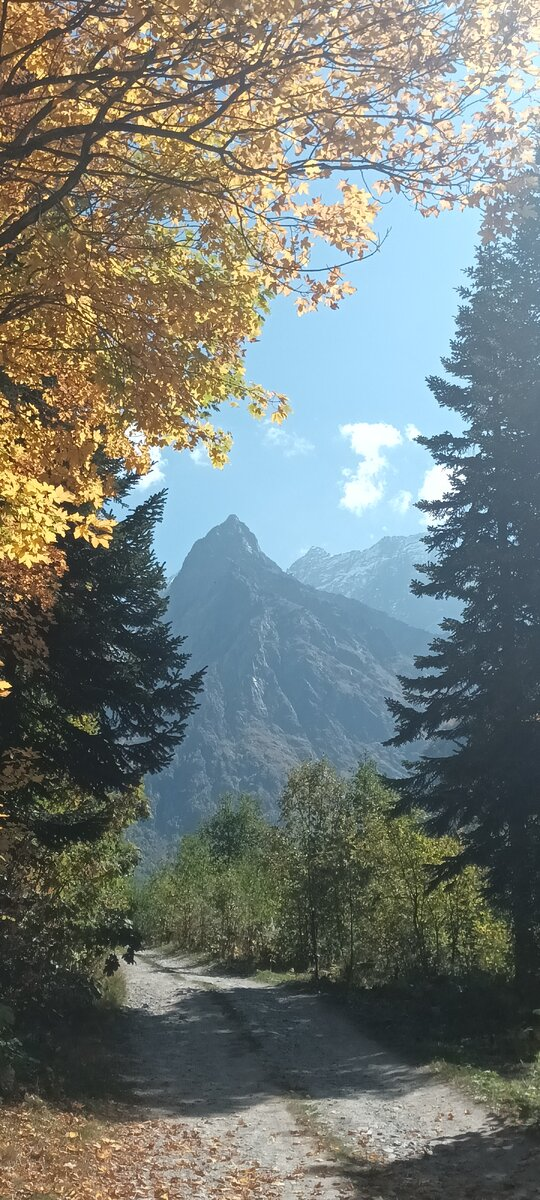 На этот водопад мы отправились в первый же день нашего отдыха на Домбае, немного не рассчитав сложность маршрута. А он был несколько труднее, чем трекинг на Чучхурские водопады. И связано это в первую очередь с тем, что в самом начале пути вас ждет затяжной неприятный подъем по грунтовке метров 300-500. Такой, что местами у нас даже дыхание перехватывало... Но потом дорога постепенно выравнивается и идет по лесу, временами выскакивая на лужайки и открывая потрясающие виды на ледник Алибек.