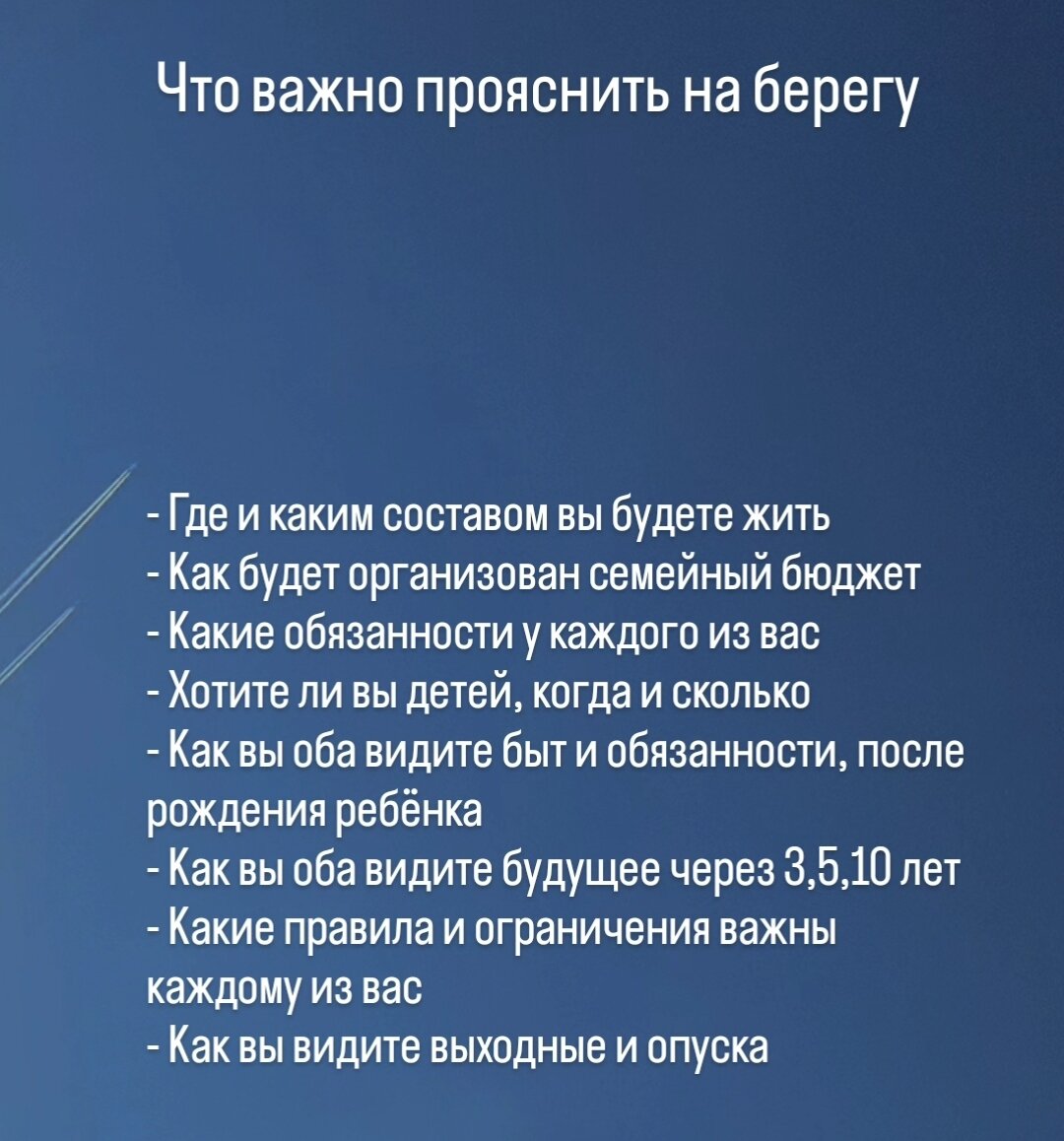 Мой ответ вас удивит 😉 Мы разочаровываемся в браке, вовсе не от того, что человек оказался плохим. Часто это связано, с тем, что мы сами выбрали закрыть глаза на некоторые детали или даже дорисовали, то чего нам не хватает. А ещё с тем, что мы не обсуждаем, как каждый из нас видит брак и семью. Перед тем, как подавать заявление попробуйте ответить на несколько вопросов! Сохраните, чтобы не потерять! Вопросы себе: 1. Почему я решила выйти замуж именно за этого человека? 2. А на самом деле почему? 3. Есть ли сейчас в наших отношений что-то, что меня настораживает, не нравится, но я закрываю на это глаза? Что с этим станет после свадьбы? 4. Есть ли что-то, что меня пугает, но я замалчиваю это? Что с этим будет после свадьбы? Это исчезнет или станет более явным? 5. Есть ли что-то, на что соглашаюсь? Терплю? Как это будет после свадьбы? Сколько я так выдержу? 6. Как я вижу жизнь с ним, через 3, 5,10 лет? 7. Удовлетворена ли я своей жизнью, без брака? Или этот брак для меня спа