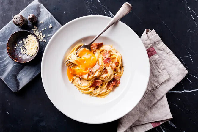 ИНГРЕДИЕНТЫ : ПРИГОТОВЛЕНИЕ : В кипящей воде отварить спагетти около 4 -5 минут до состояния аль денте. Бекон нарезать крупными кусочками и слегка обжарить на оливковом масле (15 мл). Затем добавить измельчённый зубчик чеснока и обжарить до золотистого цвета. Бекон в чесночном масле хорошенько поперчить. Отделить белки от желтков и переложить желтки в отдельную миску. Твёрдый сыр натереть на мелкой тёрке. К желткам влить 15 мл оливкового масла, добавить сыр и перемешать венчиком до однородности. Добавить 1 половник горячей воды от спагетти (контролируя консистенцию) и перемешать. Переложить в миску с желтками обжаренный бекон, спагетти и хорошенько перемешать. В конце добавить остатки сыра. Переложить пасту на порционные тарелки и посыпать сверху небольшим количеством тёртого сыра. приятного аппетита 😊💗