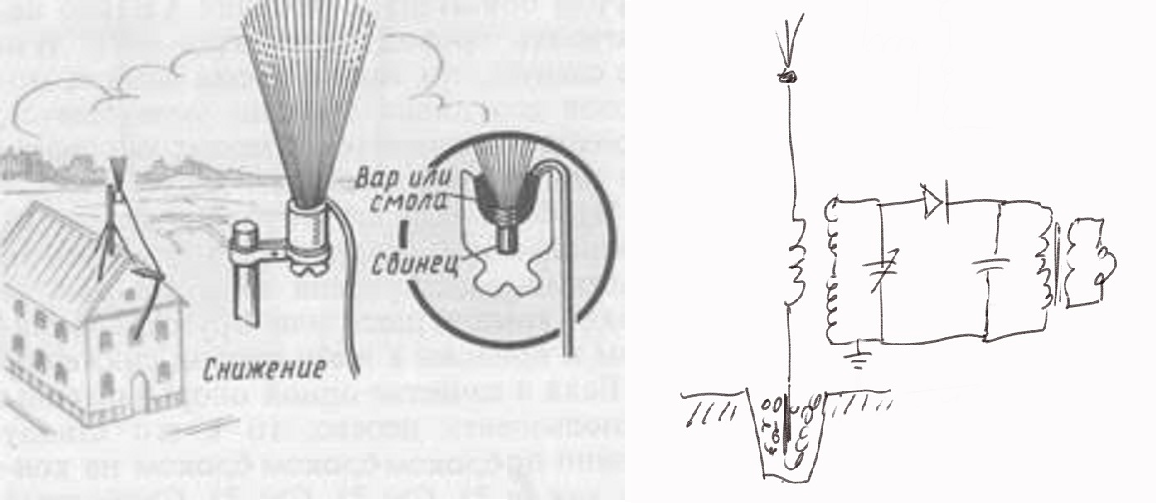 В 30-х годах прошлого века были популярны антенны данного типа. Прием велся на ДВ и СВ, и они обеспечивали достаточно хороший уровень сигнала. Но как? Антенна электрически короткая и по широко распространенному мнению это лишь вертикальный провод эффективность которого немного улучшала метелка на верхнем конце. В таком виде заметного эффекта она давать не могла. Рассмотрим одну из лучших метелочных антенн, которые выпускала фирма Central Equipment Ltd. Вот как они были устроены. Каждая антенна собиралась из пучка отрезков медной проволоки от 0,5 до 1 м, и они разводились на угол от 45 до 90 градусов. Нижний конец пучка вставлялся в массивный фарфоровый изолятор, сквозь дно которого присоединялся провод длиной около 15 м, соединяющий антенну с приемником. Провод, идущий от антенны к приемнику, чтобы изолировать его от крыши и стен дома, крепился к специальным кронштейнам-изоляторам и до самого ввода нигде ничего не касался. Ввод же устраивали из эбонитовой трубки. Медные проводники ама