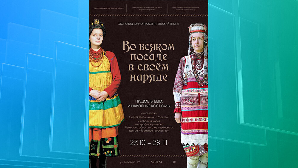 В Брянске 27 октября в художественном музее откроется экспозиционно-просветительский проект «Во всяком посаде в своем наряде». Он посвящён 80-й годовщине освобождения Брянщины от немецко-фашистских захватчиков, а также предстоящему Дню народного единства. Гости выставки увидят около трехсот комплексов крестьянского праздничного и будничного костюма различных регионов России, а также множество старинных тканых и расшитых богатым орнаментом рушников. Будут представлены костюмные комплексы Республик Бурятии, Коми, Удмуртии, Чувашии, Марий Эл, Луганской Народной Республики; Архангельской, Вологодской, Липецкой, Белгородской. И праздничный женский костюм села Дорожово Брянского района. На праздничном мероприятии будет работать выездное почтовое отделение. Все желающие смогут отправить уникальные открытки со штемпелем «Привет из Брянска». 0+ В Брянске в художественном музее откроется выставка «Во всяком посаде в своем наряде»
