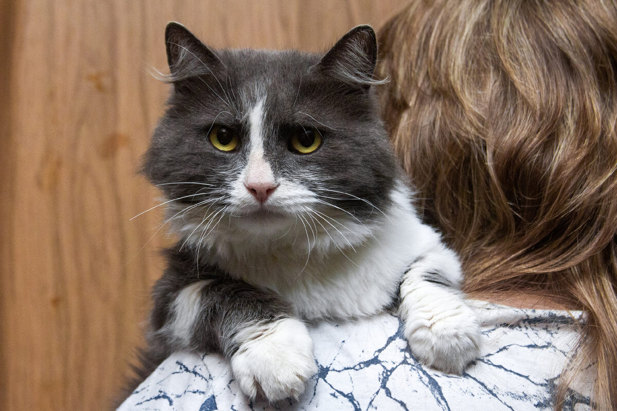 Этот красивый пушистый котик голубого окраса с белым жил у бабушки на первом этаже многоэтажного дома. Зовут его Мурзик. К окну квартиры приставлена деревянная лесенка, по которой Мурзик забирался и спускался из окна на улицу. Все было терпимо, пока бабушка не заболела. Окна оказались закрыты, а котик остался на улице. Единственным убежищем в зимнюю стужу стал подвал. Так ласковый, супер добрый, красивый котик стал уличным, никому не нужным. Зиму как-то пережил. Сейчас наступили дождливые дни. Иду вечером с работы и вижу силуэт — плотно прижавшись к стене дома под окнами бывшей хозяйки сидит мокрый продрогший Мурзик. Оказалось, что продух в подвал зашили металлом и он не смог спрятаться от дождя. Бедный, несчастный котик за что же тебе такая жизнь досталась. Мурзик неимоверно добрый кот. Гладишь его и он весело мурлыкает, радуется что его погладили. Очень красивый мальчик! Я его забрала и он сейчас живет на передержке. Ходит строго в лоток! Умничка на счет этого! Обработан от блох и гл