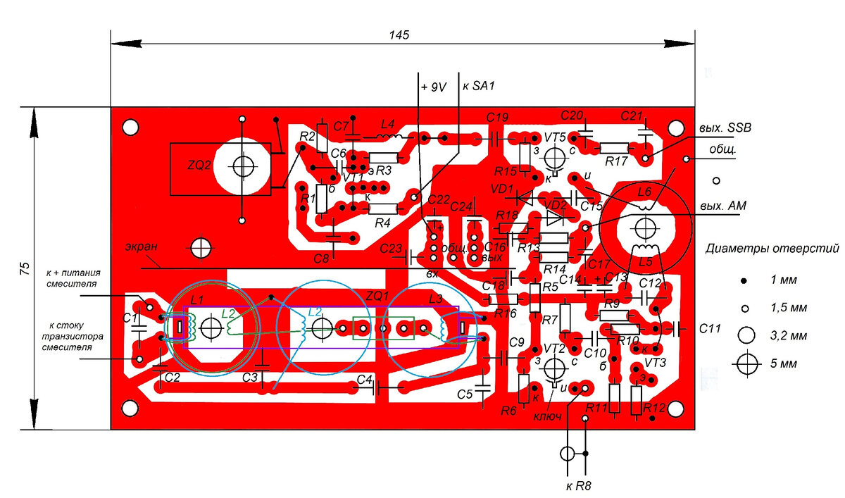 Итак, закончено оформление монтажной документации на тракт ПЧ. Также внесены некоторые исправления и поправки в схемы в двух предыдущих статьях. Вроде бы все неувязки устранены. И вот вам чертеж печатной платы тракта ПЧ со вторым гетеродином на кварцевом резонаторе.