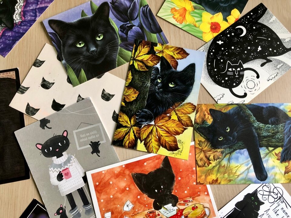 У меня всегда жили черные кошки — и черные с белыми лапками, галстуками и трусиками, и полностью черные, без единого белого волоска. Последнюю звали Багира, и выглядела она точь-в-точь, как на этих открытках художницы Ирины Гармашовой.
