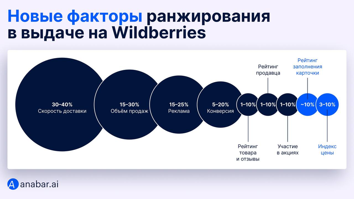 Недавно «Вайлдберриз» опубликовал документ, где описал факторы, которые влияют на ранжирование в поисковой выдаче. Скорость доставки товара до покупателя — самый главный фактор, который влияет на позицию до 40%.