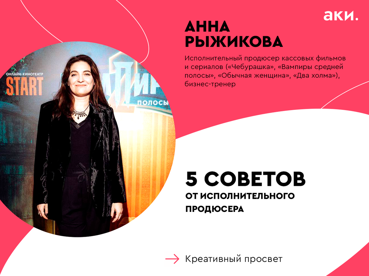 Анна Рыжикова получила актёрское образование. Шесть с половиной лет работала в бизнесе, но ушла в кино. Сегодня она исполнительный продюсер многих кассовых фильмов и сериалов («Чебурашка», «Вампиры средней полосы», «Обычная женщина», «Два холма»). Про работу в кино В кино ты можешь прочувствовать ощутимый результат своей работы, так как фильм остаётся навсегда и ты можешь в любой момент его пересмотреть. Про кейсы Процесс создания «Чебурашки» наложился и на пандемию, и на геополитический кризис в стране. Но, тем не менее, в конечном итоге получился замечательный фильм, целевая аудитория которого колеблется от 6 до 86 лет. Чебурашка — очень добрый персонаж, который вызывает улыбку и безусловную любовь у всех людей. Фильм вышел именно в тот момент, когда людям не хватало добра и сказки. Помимо сложных внешних событий, которые случались параллельно со съёмками, большое влияние на процесс оказали погодные условия. Например, в Сочи во время съёмок постоянно шли ливни, а в Кисловодске, где с
