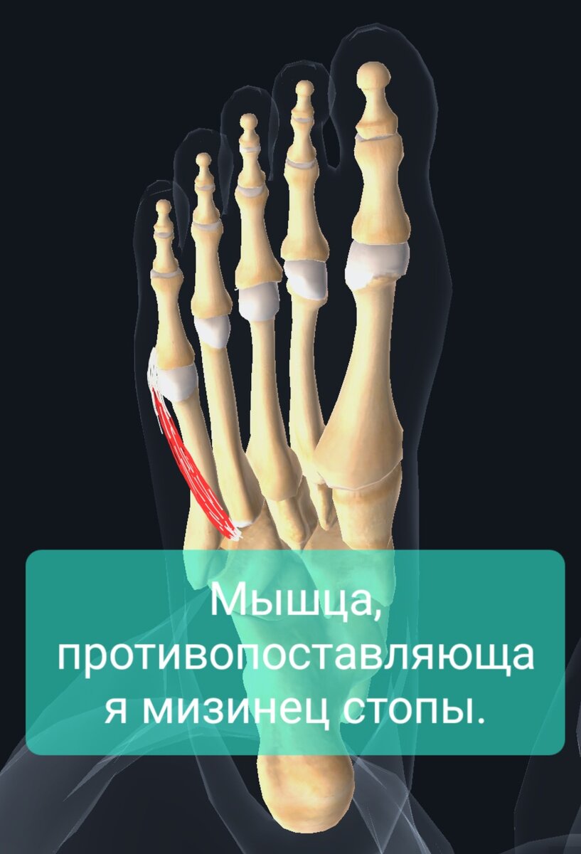 Третья, самая глубокая мышца из группы мышц мизинца стопы. И самая таинственная. Таинственность выражается в том, что мало где эта мышца описана в принципе. Даже у самых уважаемых авторов описание, скажем так, несколько странное. Так, например, в нескольких источниках указывается, что мышца, противопоставляющая мизинец стопы, начинаясь от длинной подошвенной связки, прикрепляется на 5 ПЯСТНОЙ кости. (Пясть, если что - это в кисти). Но если поискать и поизучать разные источники, в т.ч. немногочисленные иллюстрации и МРТ-анатомию, то получается следующая картинка: Начинается мышца, противопоставляющая мизинец стопы от длинной подошвенной связки и от небольшого участка на подошвенной поверхности кубовидной кости (она наиболее соответствует крючковидной кости запятья, от которой начинается аналогичная мышца на кисти). Проходит по подошвенно-латеральной поверхности пятой плюсневой кости и заканчивается на латеральной стороне основания первой фаланги мизинца стопы, вероятно, частично сра