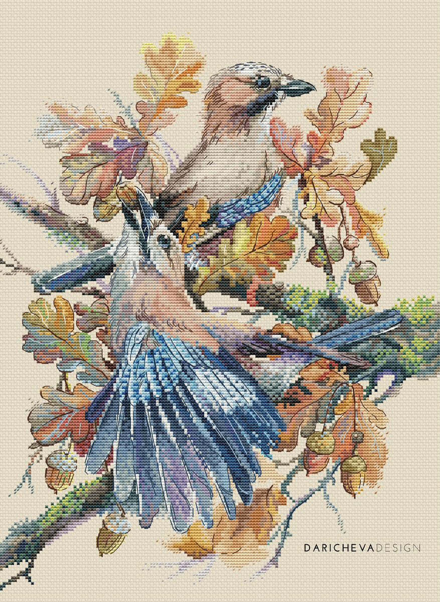 Сойки - это один из проектов, когда я поддалась эмоциям и спонтанно купила схему. Обычно я стараюсь держать себя в руках, т.к. понимаю, что всего не вышьешь, плюс хочется шить то, что потом не уйдет в "стол", поэтому заранее знаю, где будет висеть оформленная работа.