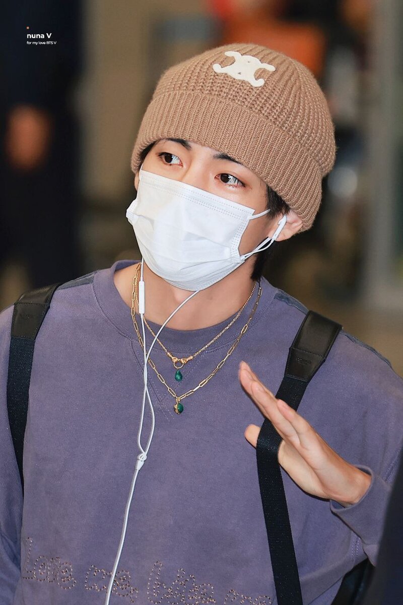 Если улетал он франтом, то вернулся в очень удобном образе, весь мягонький и осенний. За исключением тапок на босу ногу, но это ж Тэхён, все мы знаем, что для него это давно стало привычным моментом. Хотя контраст шапки и голых пальцев всё равно стабильно цепляет глаз.