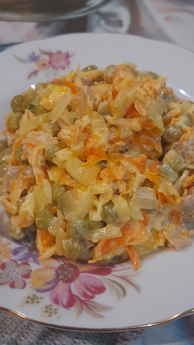 Вкусный, не сложный салат из всем доступных продуктов. Сладковатый вкус в сочетании с пикантными ноткам маринованного лука задают особенное настроение блюду. И конечно нежная, ароматная отварная свинина!!! Почему купеческий, не знаю, честно, так как ингредиенты всем доступны. Возможно в 18 веке свинину ели только купцы и для них могли готовить подобное блюдо...... Так тому и быть. Интересно?! А как вы отвариваете свинину и есть ли какие — либо тонкости для получения идеально нежного мяса? Ингредиенты салата: Свинина отварная — 300 гр.; Сыр — 150 гр.; Малосольный огурец — 1 шт.; Зеленый горошек — 1 банка; Морковь - 1 шт.; Лук репчатый — 1 шт.; Уксус и сахар по 1 ст.л.; Соль, перец по вкусу; Лавровый лист. Майонез для заправки. Приступим: Мясо отварить (солим, перчим, добавляем в бульон лавровый лист обязательно) Охладить. Нарезать кубиками, желательно в размер с горошком. Лук рубим кубиком. Маринуем (уксус+сахар+соль+перец) в течении 10 минут. По истечении времени уксус сливаем. Морковь