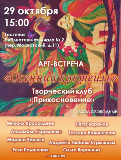 В 2011 году Творческий клуб «Прикосновение» впервые организовал арт-встречу «Осенний коктейль». Ежегодно участники «Осеннего коктейля» предоставляли всем желающим возможность погрузиться в творческую атмосферу и насладиться музыкой, поэзией и авторской песней. Очередная встреча состоится 29 октября в гостиной библиотеки-филиала № 2. В планах организаторов: рассказать об истории клуба и, следуя изначальной концепции «коктейля», представить творческие выступления разных авторов, музыкантов, поэтов и авторов-исполнителей.