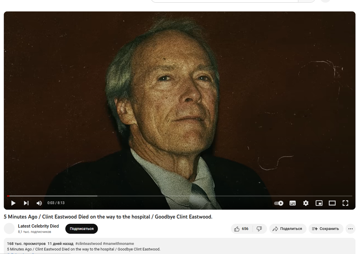 Скончался культовый герой вестернов Клинт Иствуд. Соответствующий видео-некролог появился в сети. Ролик собрал более 168 тысяч просмотров. «5 минут назад. Клинт Иствуд умер по дороге в больницу. Прощай, Клинт Иствуд», — гласила подпись к видео, которое выпустили в октябре 2023 года. Это фейк. 93-летний артист жив. Если бы новость о его кончине была правдивой, то она облетела бы все ведущие СМИ. Однако ни одно авторитетное издание информацию не подтвердило. Вызывает вопросы и репутация канала, где появился некролог. На данном ресурсе опубликовали ролики о смерти актеров Тома Круза и Дензела Вашингтона, а также музыканта Пола Маккартни и певца Рэнди Трэвиса, что не соответствует действительности. Вероятно, такими скандальными и вызывающими шок публикациями канал привлекает внимание и монетизирует свой контент. Разбираем фейки. Ищем правду за вас. Подписывайтесь!