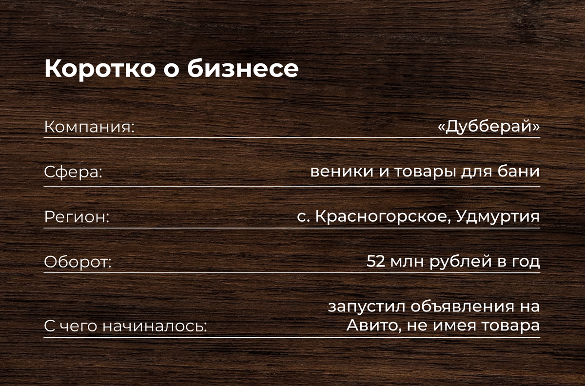История компании «Дубберай» началась 9 лет назад с обычного объявления на Авито. Его разместил Иван Чернышов – начинающий предприниматель из удмуртского села Васильевское. Тогда он ещё не знал, что с помощью пары кликов возрождалась большая компания, которая будет иметь клиентов по всему миру. О том, как из гаража вырасти в несколько производственных цехов и как продавать удмуртские веники за 10 000 км, основатель компании «Дубберай» Иван Чернышов рассказал сообществу предпринимателей «Бизнес Бизнесу».