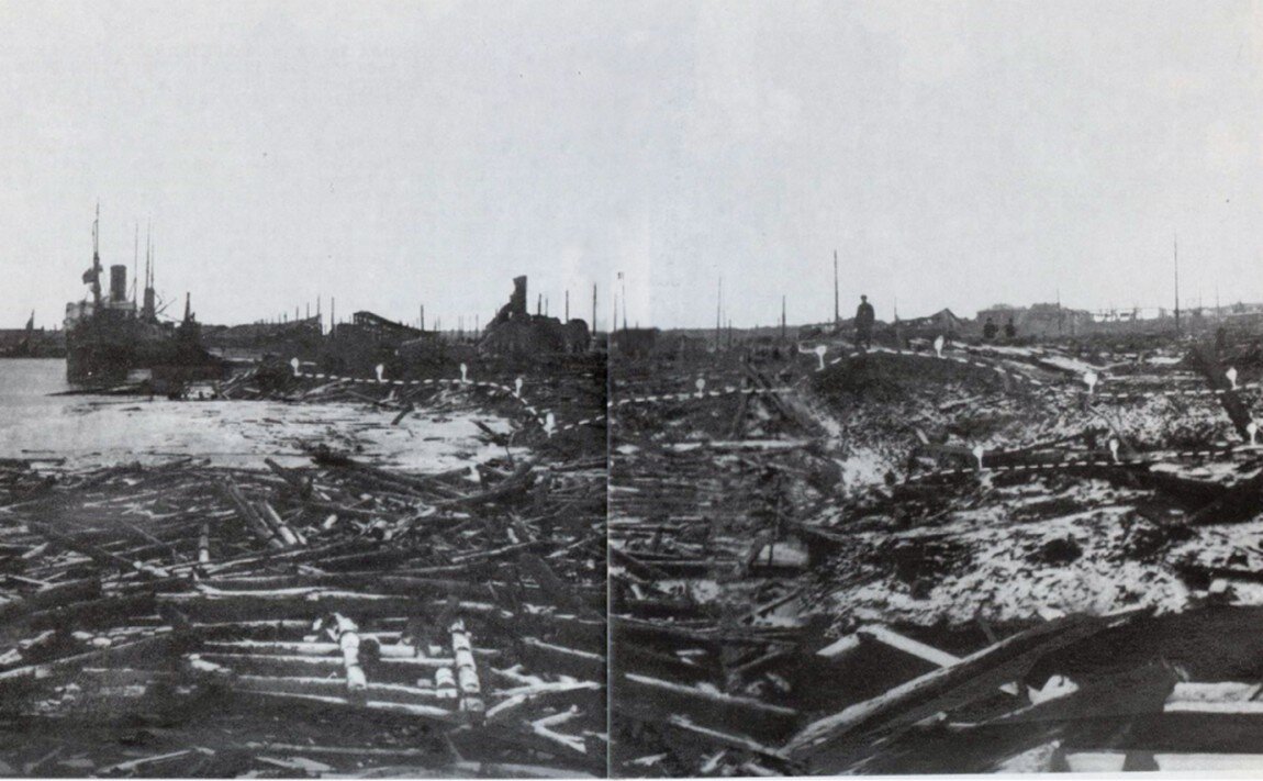 Огонь, подгоняемый ветром, стал поглощать одну постройку за другой. В тот день сгорели 27 бараков и 5 строений. А 49 пришвартованных рядом судов, на некоторые из которых тоже была взрывчатка, стали по очереди взлетать на воздух.