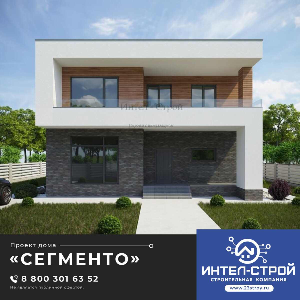 Большое количество террас и балконов на первом и втором уровнях, а также современное оформление фасадов в стиле хай-тек керамическим кирпичом и декоративной штукатуркой с использованием декоративных элементов с текстурой дерева. Коротко о проекте дома: