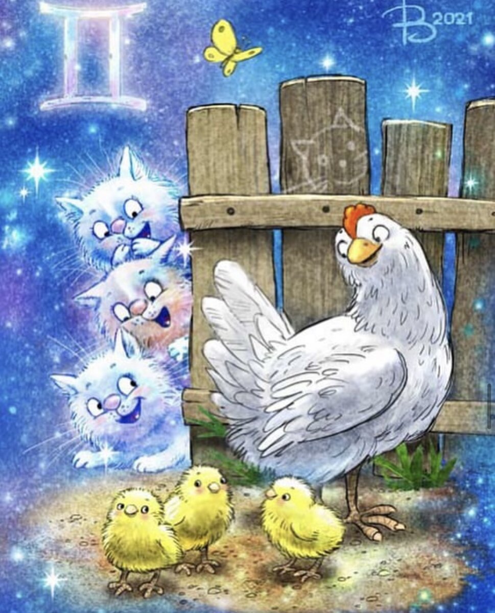 Как мы похожи На этих синих цыплят Да близнецы вы. Как моя шерстка Кошечку Овен спросил Теплая очень. Год быка настал Кот трубит му- му -му -му Настоящий друг. Кот не волнуйся Когти тебе подстригу Праздновать будем. Звёздные рыбы Звёздная будет уха Кот размечтался. *** Картинки Рина Зенюк Хокку автора *** Как вам астрологическая подборка? Хотите продолжения ? Делитесь, кто Вы по гороскопу?