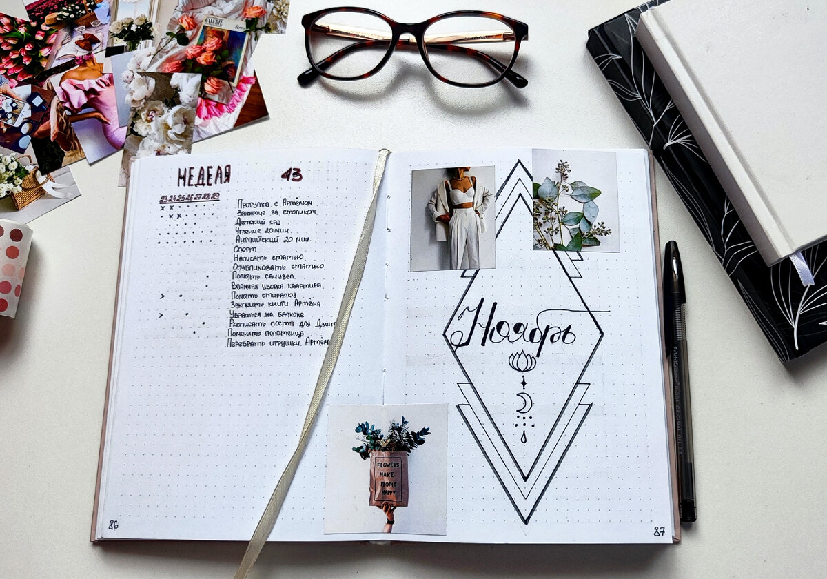 Как горячие пирожки в духовке подоспели, так и я уже, по сложившейся традиции, спешу показать Вам развороты своего ежедневника на месяц. Ноябрь я решила выложить немного раньше, чем делала это с остальными месяцами. Мне показалось, что так будет лучше и удобнее. Но если это не так, то дайте мне знать) Показываю и рассказываю, что сделала в этом месяце. Первую страничку месяца я оформила с таким причудливым рисунком и несколькими наклейками. В отличии от прошлых месяцев, наклеек на этом развороте совсем немного. Календарь на месяц решила сделать побольше. Видела у других подобные варианты оформления и захотела тоже попробовать. В этом месяце нет ни каких важных дат и вероятно календарь останется в таком же виде, разве, что могут наметиться какие то встречи или записи. Неизменный разворот из "двух строк в день", перекочевал ещё с прошлого ежедневника, правда там была "одна строка в день". Суть та же, но в прошлой версии мне немного не хватало места, а сейчас всё как надо. Моя новинка