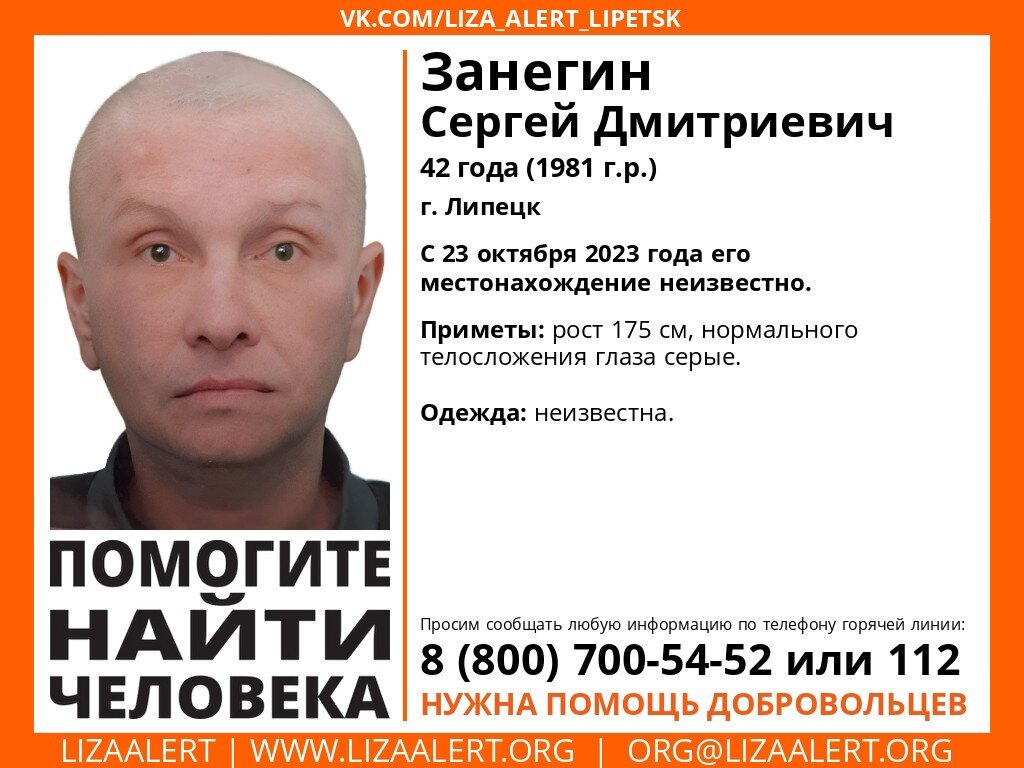 В Липецкой области ищут пропавшего 42-летнего Сергея Дмитриевича Занегина. Об этом сообщает региональный поисковый отряд «Лиза Алерт». О местонахождении мужчины из областного центра ничего не известно с минувшего понедельника, 23 октября, когда мужчина перестал выходить на связь с родными. Приметы Сергея: рост 175 сантиметров, нормального телосложения и с глазами серого цвета. Поиски осложнены тем, что одежда, в которой был мужчина в день исчезновения, неизвестна. Всех, кто что-нибудь знает о возможном местонахождении или видел пропавшего липчанина, просят сообщать об этом по телефонам 112 или 8 (800) 700-54-52.