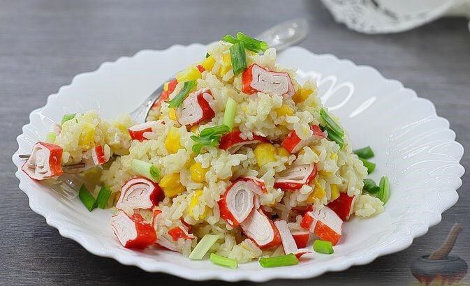 Если лень готовить ! Ингредиенты : Рис пропаренный — 200 г Крабовые палочки — 200 г Кукуруза замороженная — 100 г Яйца — 2 шт. Масло растительное — 30 мл (2 ст. ложки) Соль — по вкусу Перец чёрный молотый — по вкусу Лук зелёный (для подачи) — 10 г Приготовление : Рис используйте любого сорта, у меня – пропаренный.