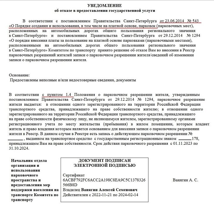 Теперь на одну квартиру оформляется лишь одно льготное разрешение на парковку автомобиля, а не два, как раньше. На это обратили внимание жители Васильевского острова, где, как сообщало FederalCity, платная парковка вводится с 1 ноября. - Центр управления парковками и комитет по транспорту писали, что выдается два разрешения на квартиру, без каких-либо ограничений, и вдруг жителям начали приходить отказы, - рассказывает одна из обитательниц района. Такие отказы на льготную парковку приходят сейчас жителям ВО. Источник: ВК И. Баханович В чем тут дело, попыталась выяснить юрист-общественница Ирина Баханович. Она заметила, что 22 сентября на сайте Городского центра управления парковками Петербурга были внесены изменения в постановление № 1294 о введении платной парковки, в части правил выдачи льготных разрешений местным жителям. И из измененного пункта следует, что разрешение выдается лишь одному транспортному средству на одну квартиру. Между тем ранее правила были совсем иными, о чем до с