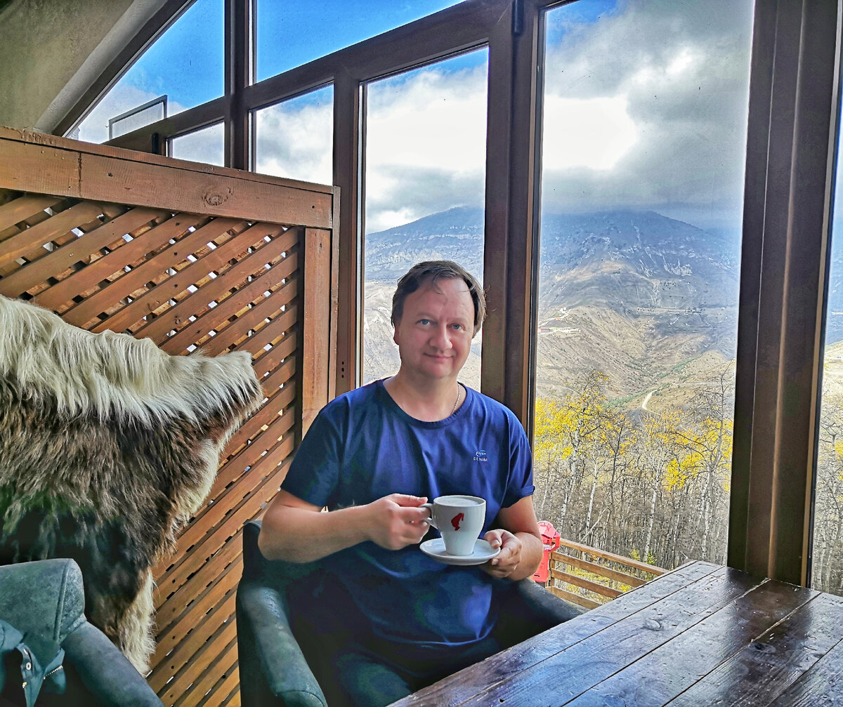 Приятно попить кофеёк на высоте 1520 с видом на горы из окна. Здесь, в Армхи, где мы живём в Ингушетии есть канатная дорога которая от отеля возит вверх, на обзорную площадку которая называется в переводе на русский вроде как "гнездо орла". * Здесь же расположен и ресторан "Эрзи", что переводится с ингушского языка как орёл. Птица эта с древних времён особо почитаема у местных жителей. Более того, в период язычества орёл, в одном из своих образов, входил в перечень почитаемых богов. ** Здесь же начинается горнолыжная трасса, она конечно идёт конечно вниз и в 20-ти градусную осеннюю погоду без снега стоит, но по ней скатываются велосипедисты. Тут сейчас на сборах несколько спортивных команд, в том числе команда триатлонистов, которые тренируются в условиях высокогорья. Я вот не решился брать велосипед в аренду, хотя можно было, а эти спортсмены на велосипедах даже на самый верх забираются, туда где я забираюсь на канатной дороге. *** Мне хватает в виде физической нагрузки и обычны