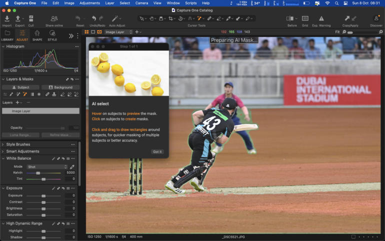 Когда вы выбираете инструмент маскирования ИИ, нужно подождать от 5 до 10 секунд предварительной обработки, прежде чем можно будет использовать инструмент для создания автоматических масок. Поначалу это может показаться контрпродуктивным, потому что пользователи Adobe будут знакомы с созданием грубой маски, не ожидая пока ИИ сделает свое дело. Похоже, что Capture One Pro разделил обработку ИИ на два раздела.