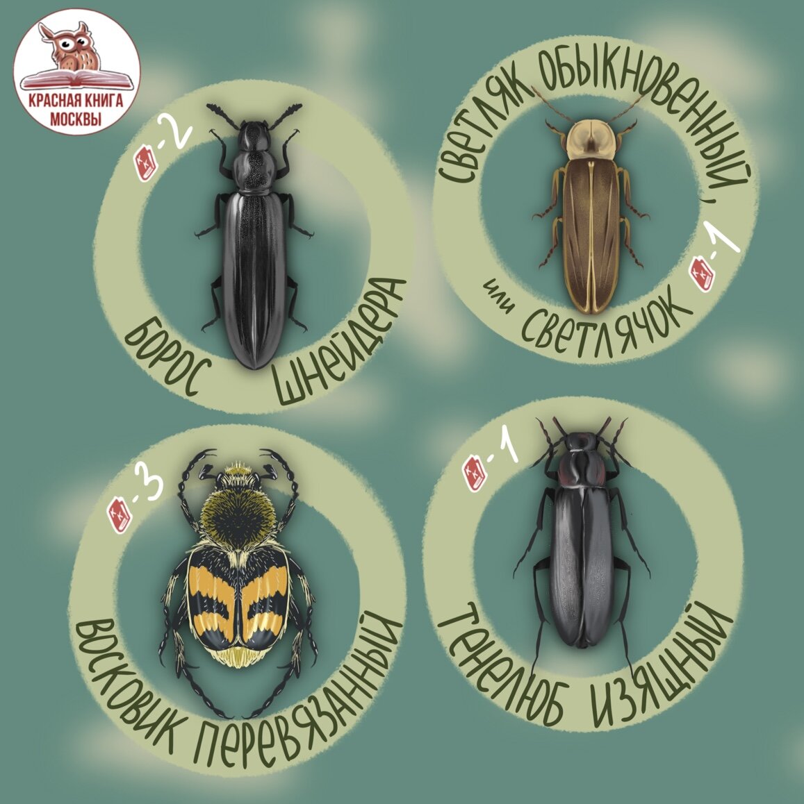 В Красной книге Москвы восковик перевязанный под 3 категорией редкости, светляк обыкновенный, или светлячок под 1 категорией редкости в границах «старой» Москвы и под 4 категорией на присоединённых территориях к городу Москве в 2012 году и в дальнейшем, тенелюб изящный под 1 категорией редкости, Борос Шнейдера под 2 категорией редкости. У жесткокрылых есть особенность, для представителей отряда характерны грызущий и жующий ротовой аппарат, развитая передняя часть груди, подвижное сочленение переднегруди с её средней частью. У животных этого отряда развито полное превращение, от стадии яйца. Жуки являются крупнейшей группой среди насекомых и живых существ в целом. О строении жуков можно узнать больше тут: https://t.me/moscowredbook/1836. О восьми представителях из Красной книги Москвы подробнее здесь: https://t.me/moscowredbook/1793 и https://t.me/moscowredbook/1956. Поделиться о том, каких необычных жуков видели вы, можно тут: https://t.me/moscowredbook/1796. Первый представите
