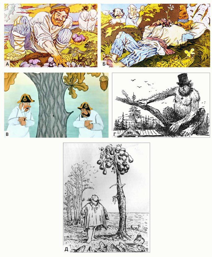 5.5. Расположите иллюстрации (исключая лишнюю) в правильном порядке в соответствии с развитием сюжета. В ответе запишите соответствующую последовательность букв. Учитывается полностью верный ответ.