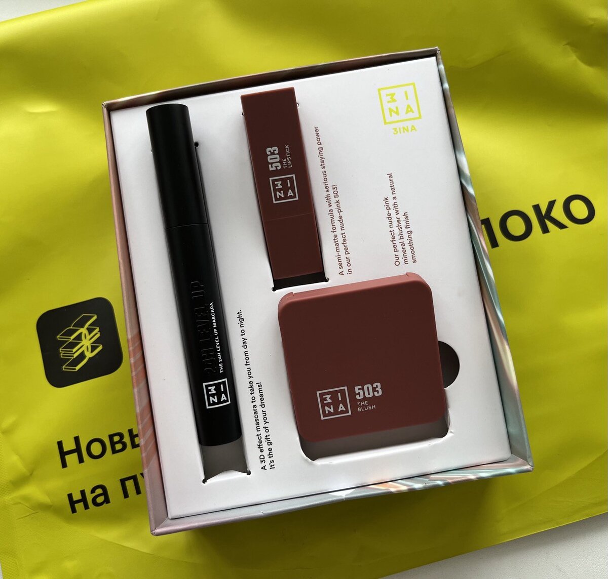 Так… в предыдущем посте я писала, что у ЗЯ были скидки и я успешно потратила денюшки. Прелестно! И что ж я там такого купила? Ну вообще, я долго думала что ж мне хочется такого. И вот оно - мне пришла идея 😎. А не прикупить ли мне какой-нибудь наборчик декоративной косметики. Я на самом деле думаю, что это хорошая покупка, когда ты хочешь попробовать новый продукт и желательно сразу несколько позиций, а тратить много денег не хочется. Тут для нас открывается выбор из наборов косметики. Как итог у вас есть несколько продуктов бренда и выходят они дешевле, чем покупать каждый самостоятельно. И вот я полезла смотреть что же нам предлагает ЗЯ. Взгляд мой зацепился за 3 набора разных брендов, нооо, так как, 2 из 3 варианта пришлось бы ждать(а ждать я не люблю) - стала рассматривать 3 вариант к покупке. 3 вариантом - оказался набор 3INA the day-dreaming. Давайте ж на него посмотрим и разберём все досконально что я там себе прикупила… Набор состоит из 3 продуктов: тушь для ресниц The 24H L
