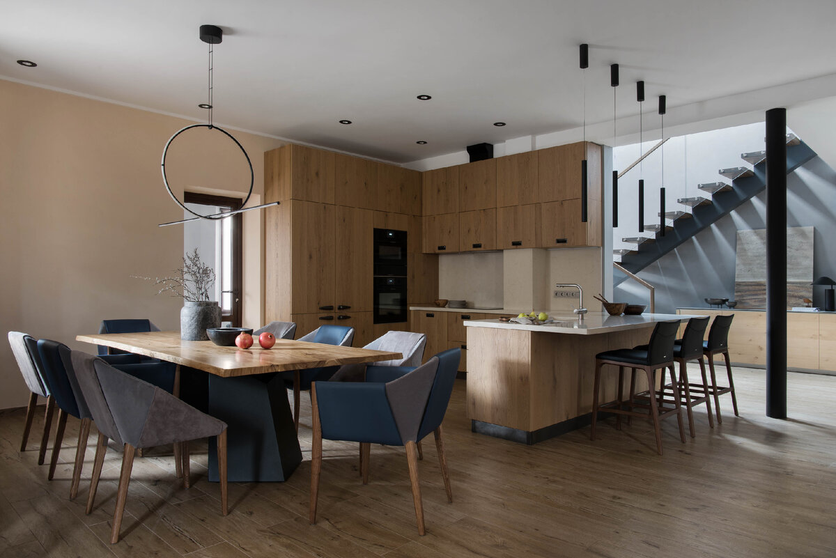 Дизайнер Дина Вафина реализовала проект современного дома в духе горного шале. Светлый интерьер с природными акцентами создал атмосферу, располагающую к отдыху от городского шума. Заказчики проекта — любители натуральных материалов в интерьере, поэтому изначально появилась идея создания альпийского дома, который в ходе работы трансформировался в современное пространство с обилием дерева в отделке. В процессе реализации дизайн-проекта важно было проработать сложную неравномерную архитектуру пространства, чтобы сделать его более просторным. К работе приступила, когда дом представлял из себя кирпичную коробку с беспорядочно расположенными конструктивными элементами. Основными пожеланиями заказчиков стали сочетание натуральных материалов с современными решениями и создание атмосферы для отдыха от города. На первом этаже дома организована зона приема гостей: изолированная входная группа, просторная и одновременно камерная кухня-гостиная с «П»-образной кухней и обеденной группой. В эркере ра